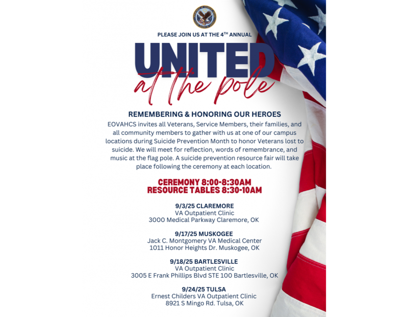 EOVAHCS invites all to gather with us at one of our campus locations during Suicide Prevention Month to honor Veterans lost to suicide. We will meet for reflection, words of remembrance, and music at the flag pole. A suicide prevention resource fair will take place following the ceremony at each location. Ceremony 8:00-8:30AM. Resource fair 8:30-10AM.